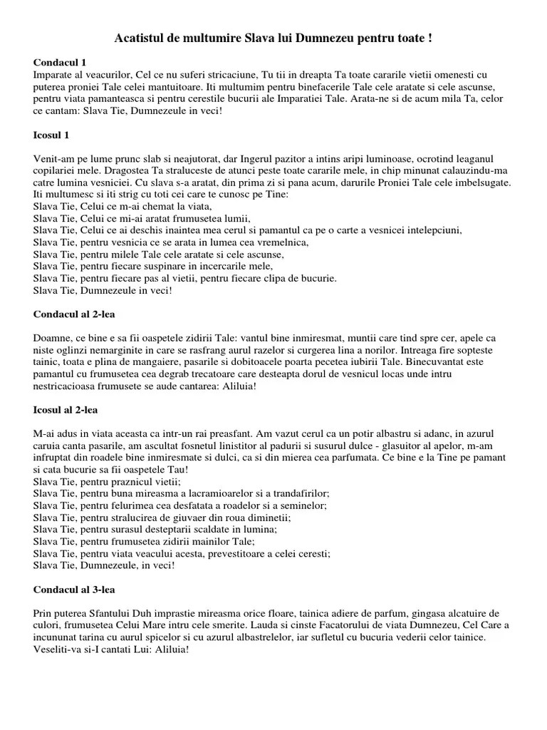 Iti multumesc si iti … Acatistul de mulţumire „slavă lui dumnezeu pentru toate!" condacul 1 împărate al veacurilor, cel ce nu suferi stricăciune, tu ţii în dreapta ta toate cărările vieţii omeneşti cu puterea proniei tale celei mântuitoare. Acatistul catre atotputernicul dumnezeu,la vreme de necaz sau de ispita:.. Iti multumesc si iti …